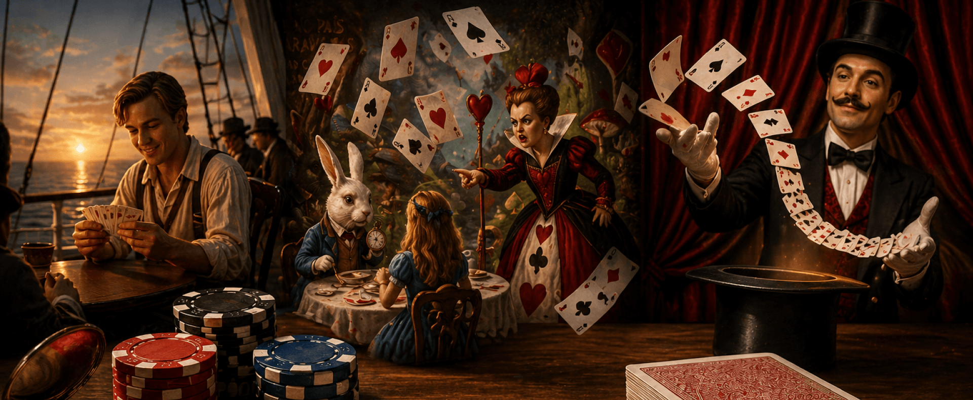 Desde tempos antigos, as cartas fazem parte da cultura em diferentes partes do mundo. Elas aparecem em momentos marcantes do cinema e da literatura, como em Titanic, onde o personagem Jack ganha sua passagem para o navio em uma partida de cartas, mudando completamente o rumo de sua vida. Ou ainda no universo fantástico de Alice no País das Maravilhas, onde figuras como a famosa Dama de Copas mostram como o baralho também pode ganhar vida no imaginário popular.