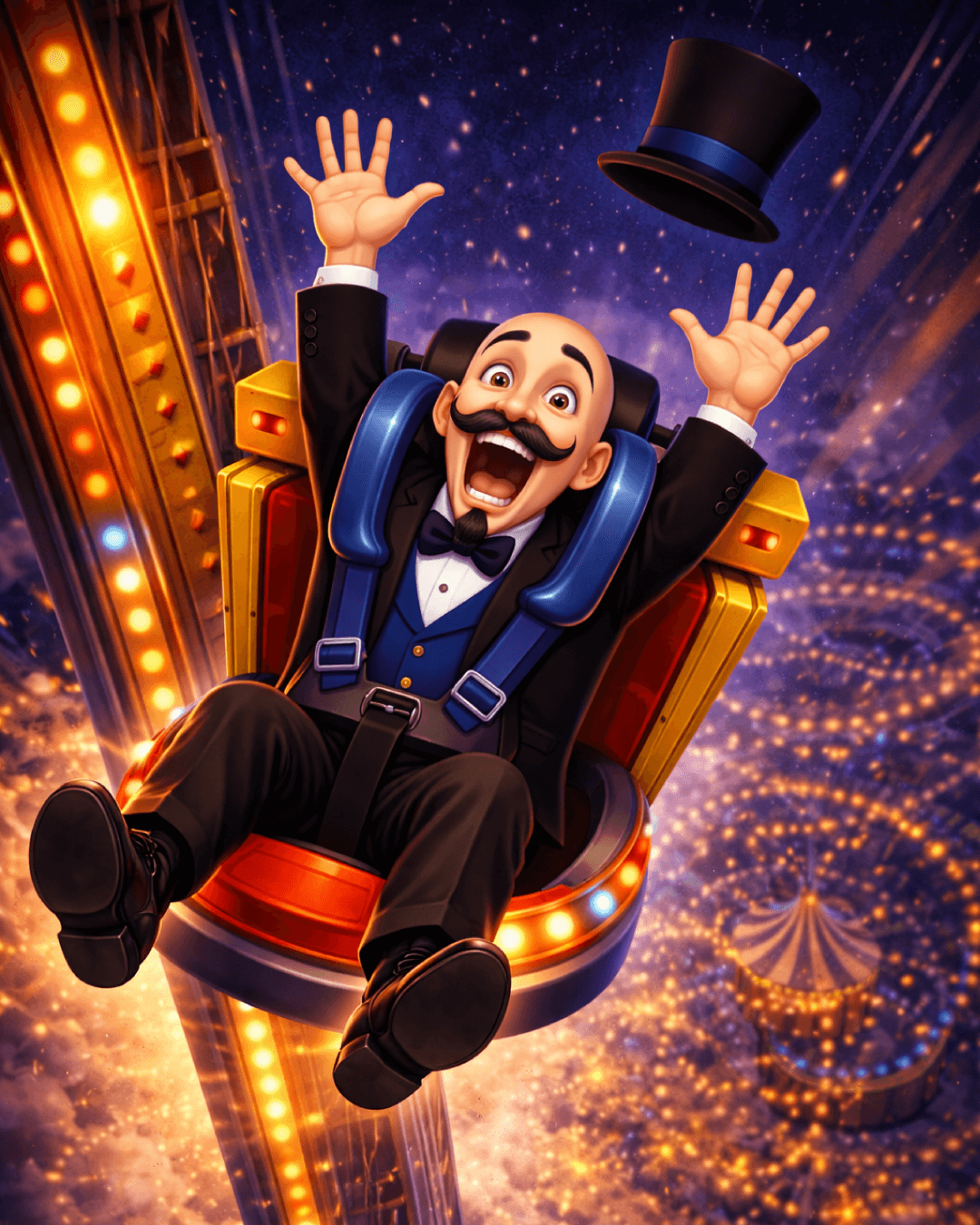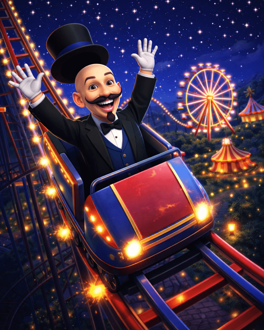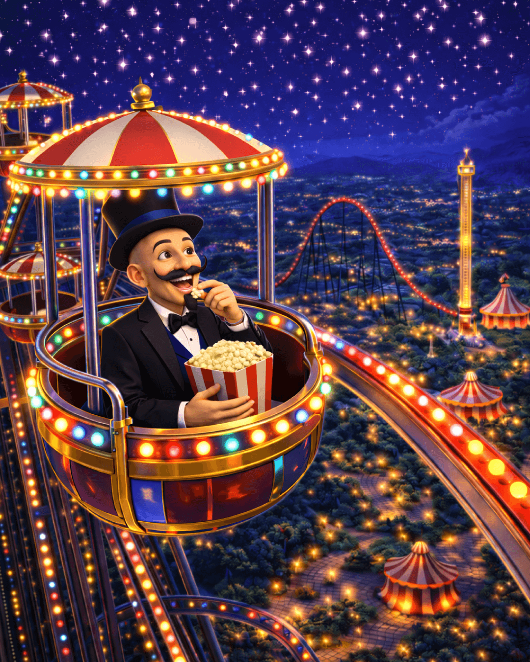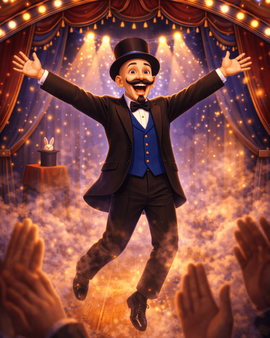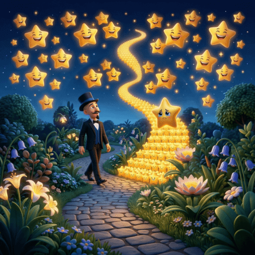 Ele tirou sua cartola, fez um pequeno gesto mágico e… puf! Uma escadinha de estrelas apareceu ligando o jardim até o céu.