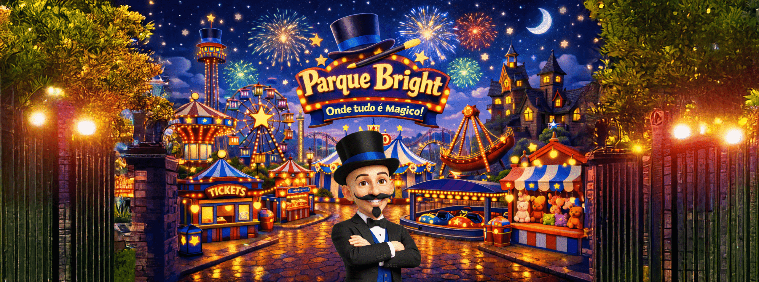 Ao lado do teatro onde o mágico Mr Bright se apresentava, havia um lindo jardim cheio de flores, bancos e pequenas luzes que pareciam vagalumes.